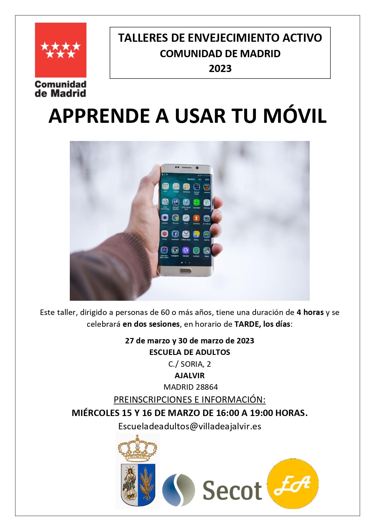 Preinscripciones e información, miércoles 15 y jueves 16 de marzo de 16.00 h a 19.00 h o a través del correo escueladeadultos@villadeajalvir.es.