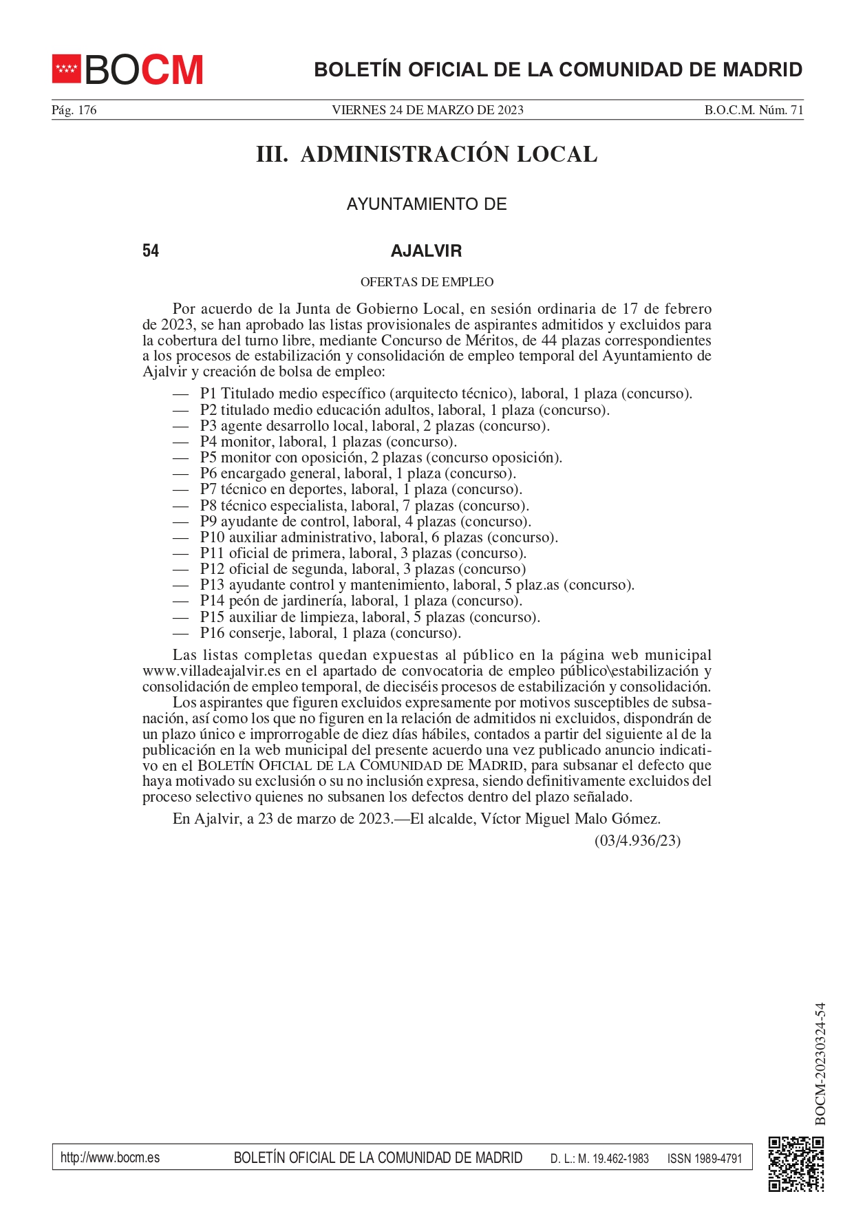 Se han aprobado las listas provisionales de aspirantes admitidos y excluidos para la cobertura del turno libre , mediante Concurso de Méritos , de 44 plazas correspondientes a los procesos de estabilización y consolidación de empleo temporal del Ayuntamiento de Ajalvir .