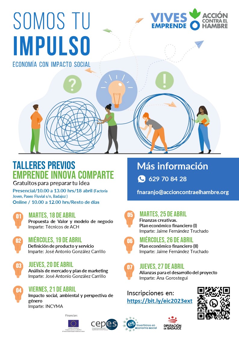 Acción contra el hambre y Diputación de Badajoz organizan el Concurso para premiar a los mejores Proyectos de personas desempleadas emprendedoras, comprometidas con la sostenibilidad en Extremadura y la economía social y que acepten el reto de impulsar su idea de negocio a través de talleres prácticos y asesoramientos expertos.