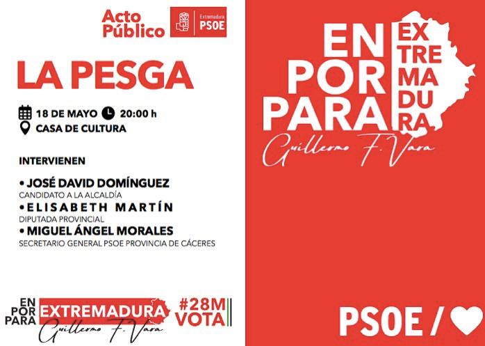 Se comunica a la vecindad, que el próximo jueves, 18 de mayo, tendrá lugar un acto público del PSOE, a las 20:00h en el salón de actos de la Casa de la Cultura.