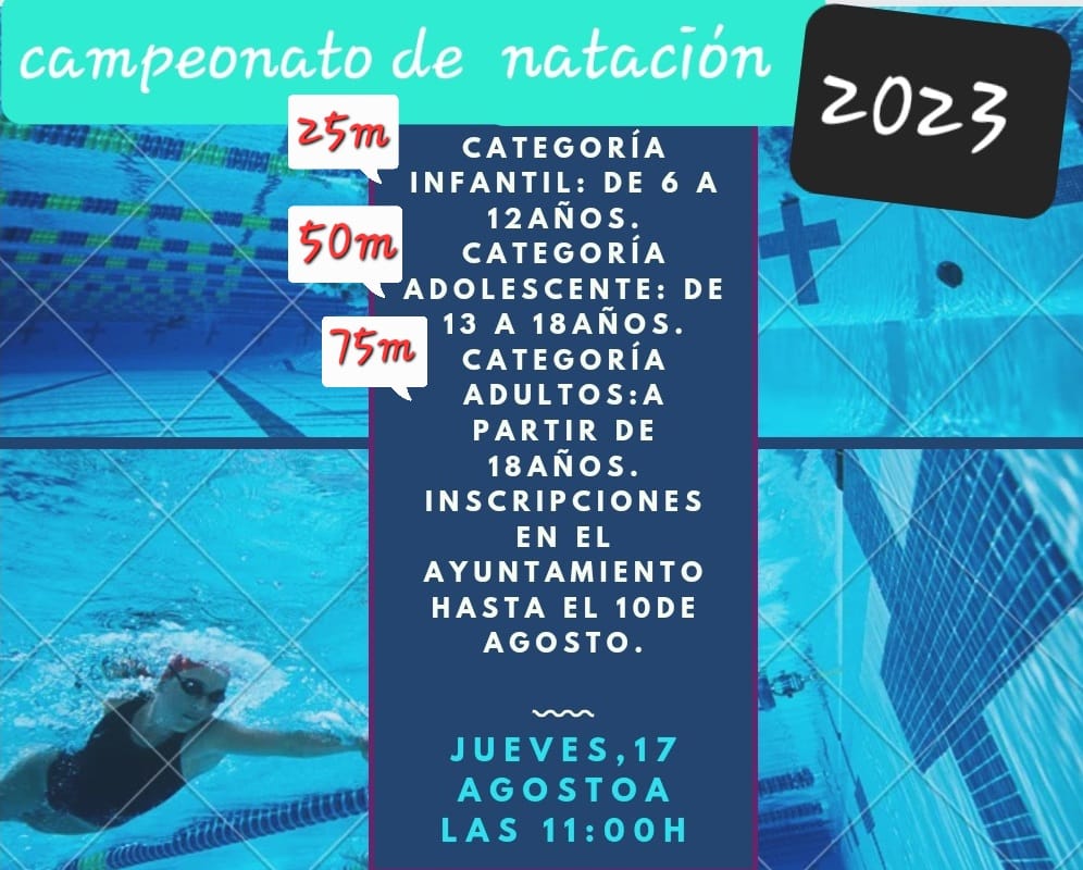 Se informa a tod@s l@s interesad@s en participar en el Campeonato de Natación que se celebrará el día 17 de Agosto a las 11:00 h en las Piscinas Municipales, con motivo de las Fiestas de la Aceituna, pueden pasar a inscribirse por el Ayuntamiento.