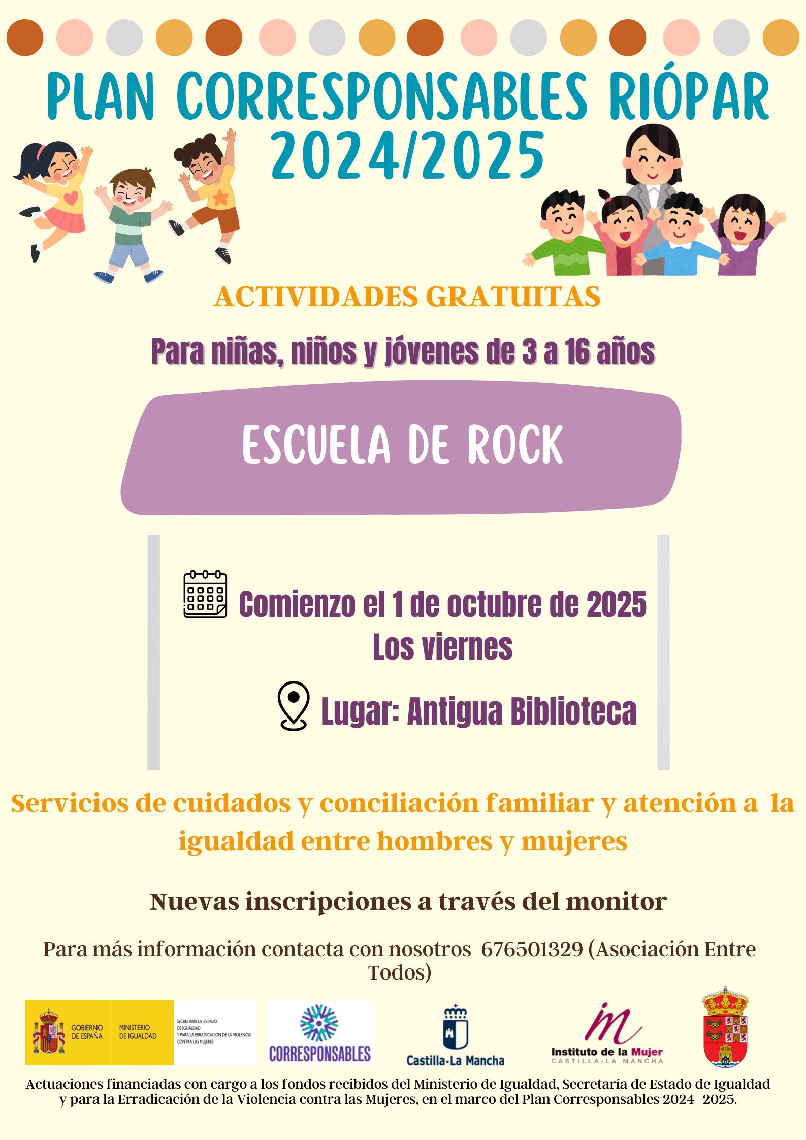 Se informa del inicio del servicio de Escuela de Rock a través del Plan Corresponsables. Servicio de cuidados y conciliación familiar y atención a la igualdad entre hombres y mujeres para niños, niñas y jóvenes de 3 a 16 años.