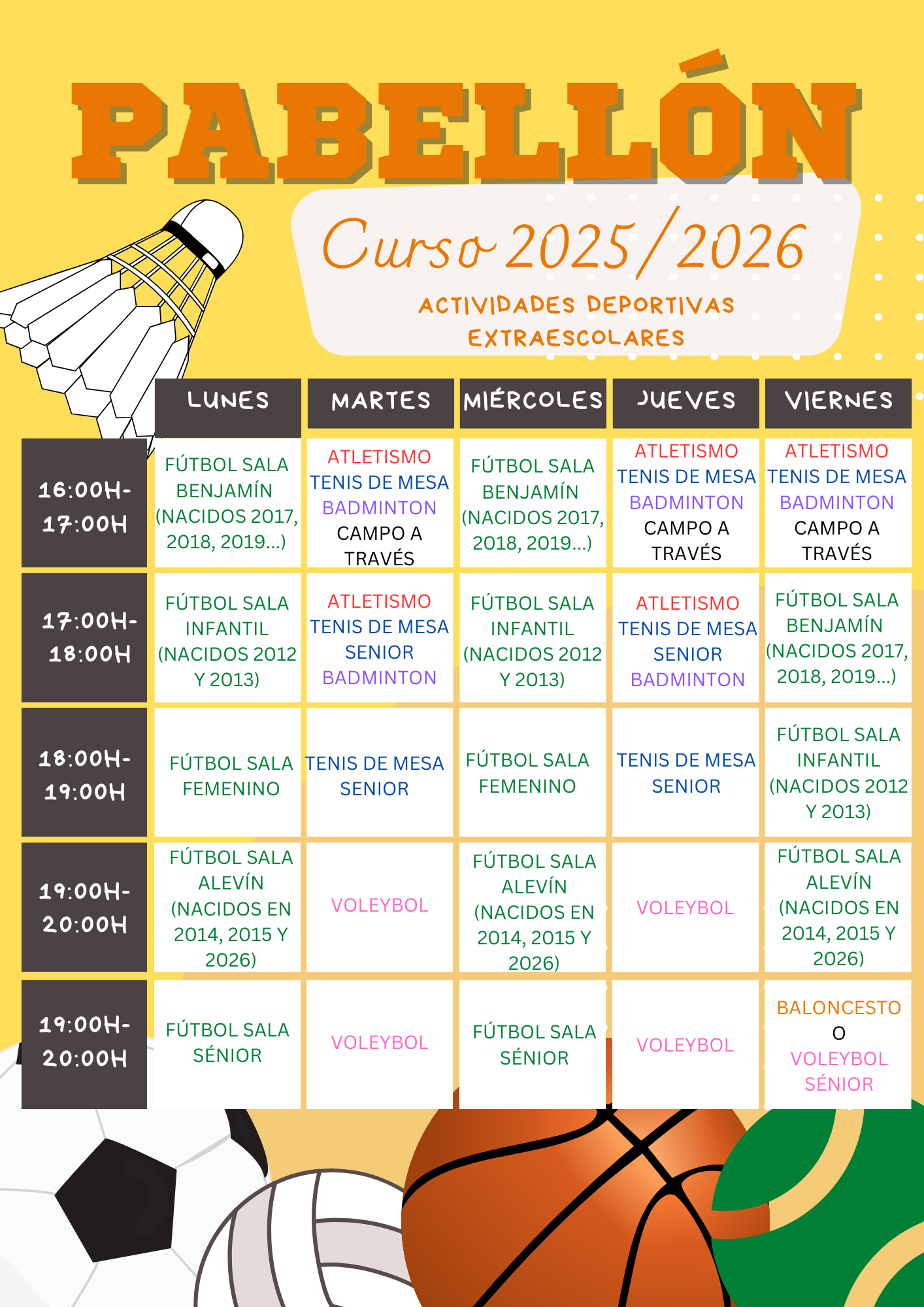 Adjuntamos el horario con todos los deportes que se desarrollarán en el Pabellón durante este curso, teniendo en cuesta que este podrá ir sufriendo cambios en función de la demanda.