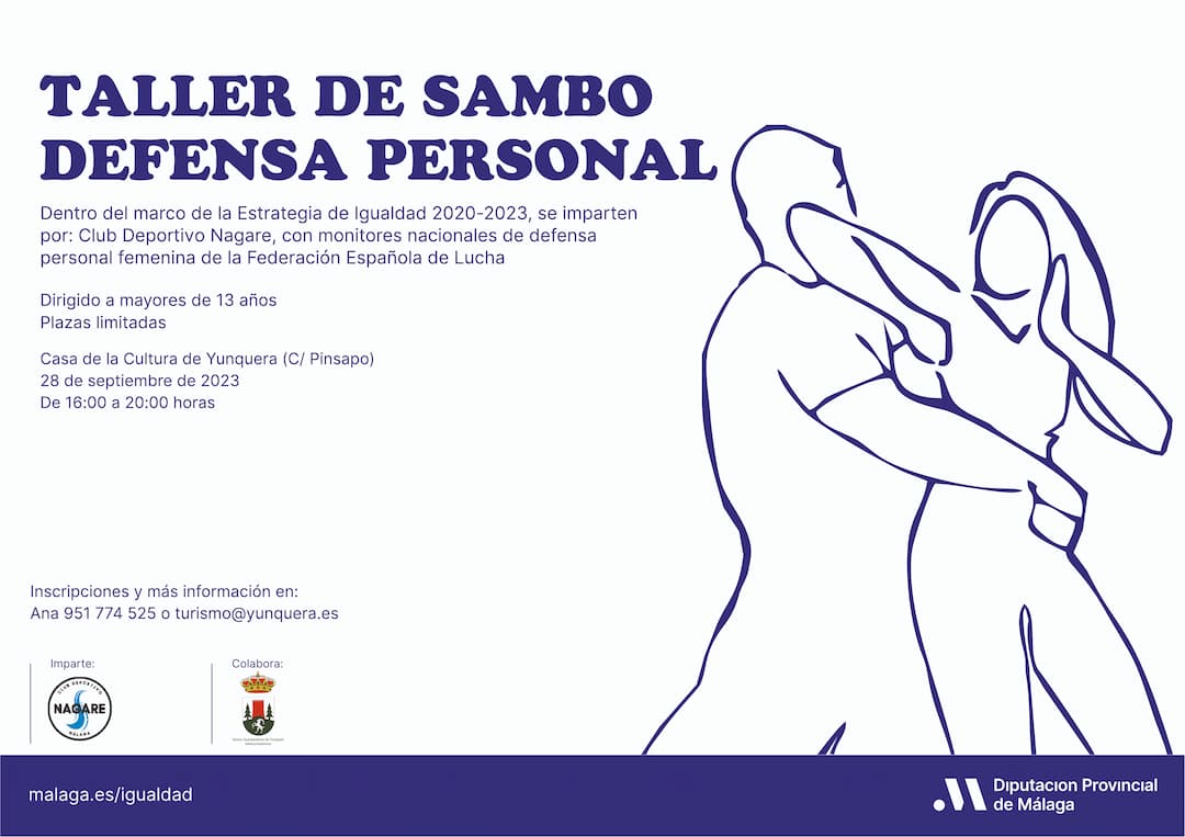 📢 Nuevo taller de defensa personal2023-09-13 10:30:00Info GeneralDesde el área de igualdad de la Diputación de Málaga en colaboración con el Ayuntamiento de Yunquera y el Club Deportivo Nagare, organizamos un taller de sambo defensa personal el próximo jueves 28 de septiembre en la Casa de La Cultura, en horario de 16 a 20 horas.